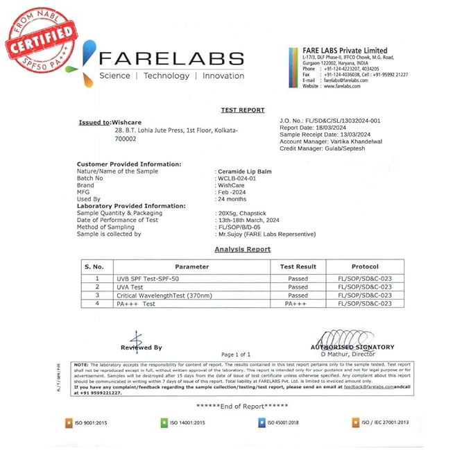 SPF 50, PA+++ WITH CERAMIDE PROTECTION : WishCare Ceramide Lip Balm with SPF is uniquely formulated with broad-spectrum SPF 50 protection, shielding your lips from harmful UVA and UVB rays. At the same time ceramide locks in moisture and gives you healthy lips