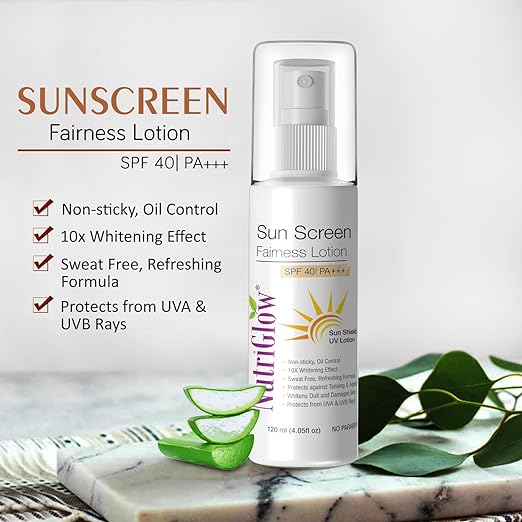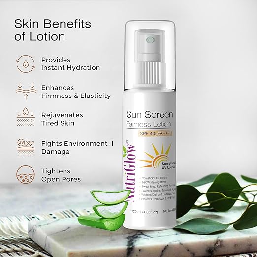 Introducing NutriGlow's Sunscreen Lotion, formulated for all skin types, including dry and sensitive skin. Our non-greasy formula provides broad-spectrum SPF 40 protection. Free from parabens and sulfates, this 120 ml lotion offers gentle care for your skin.Introducing NutriGlow's Sunscreen Lotion, formulated for all skin types, including dry and sensitive skin. Our non-greasy formula provides broad-spectrum SPF 40 protection. Free from parabens and sulfates, this 120 ml… See more |